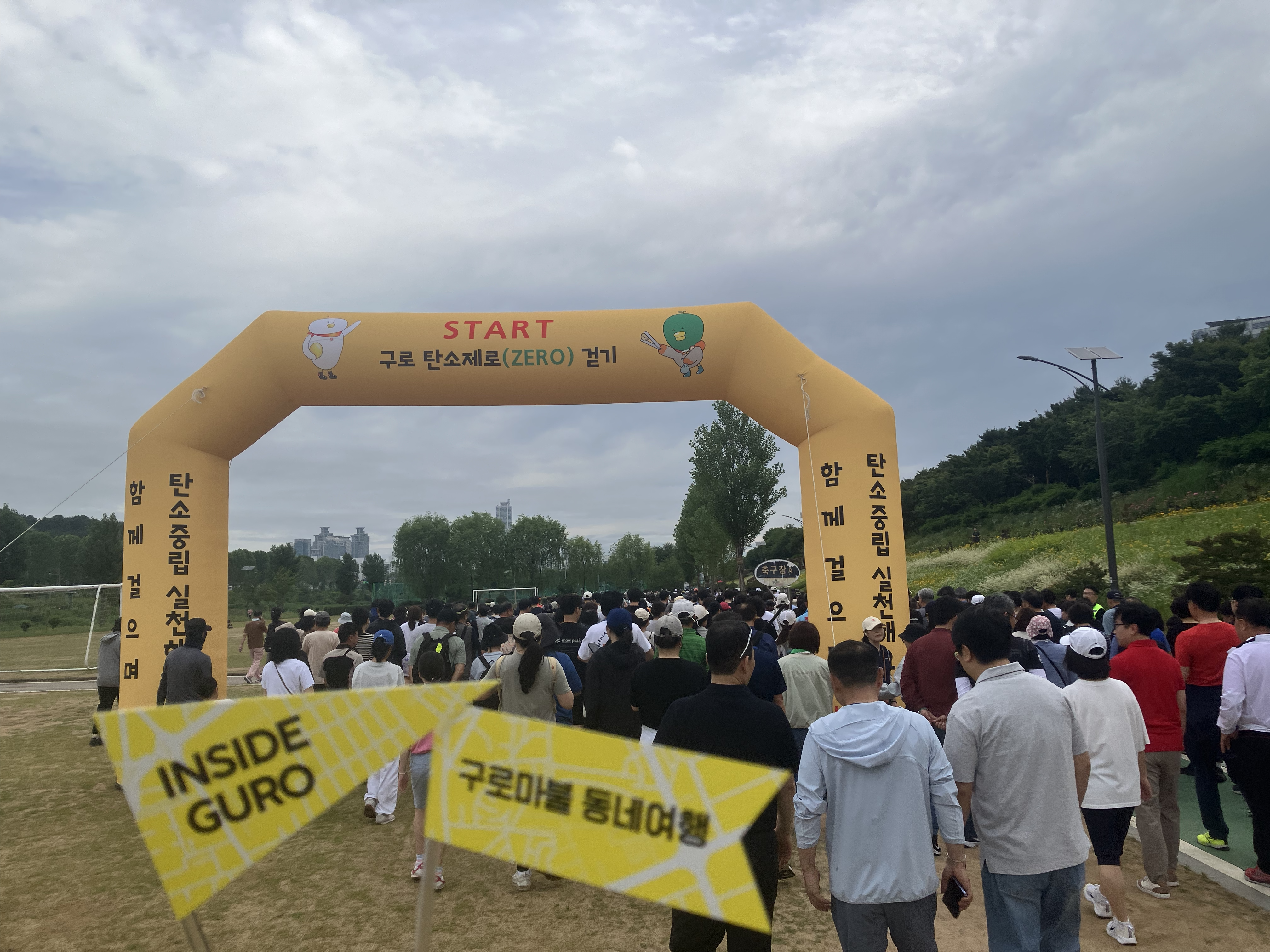 첫 행선지는 안양천 고척교였다. 7시 30분이라는 이른 시간에 안양천에 방문할 일은 드물다. 응당 그 시간에 하천변을 산책하는 사람들도 적어야 할 것이다. 하지만 오늘만큼은 잔디광장에 사람이 가득 찰 만큼 인파가 몰렸다. 오늘 개최되는 구로 탄소제로 걷기 오프라인 행사가 연 4회, 상반기 6월과 7월 그리고 하반기 9월과 11월에만 진행되기 때문일 것이다.