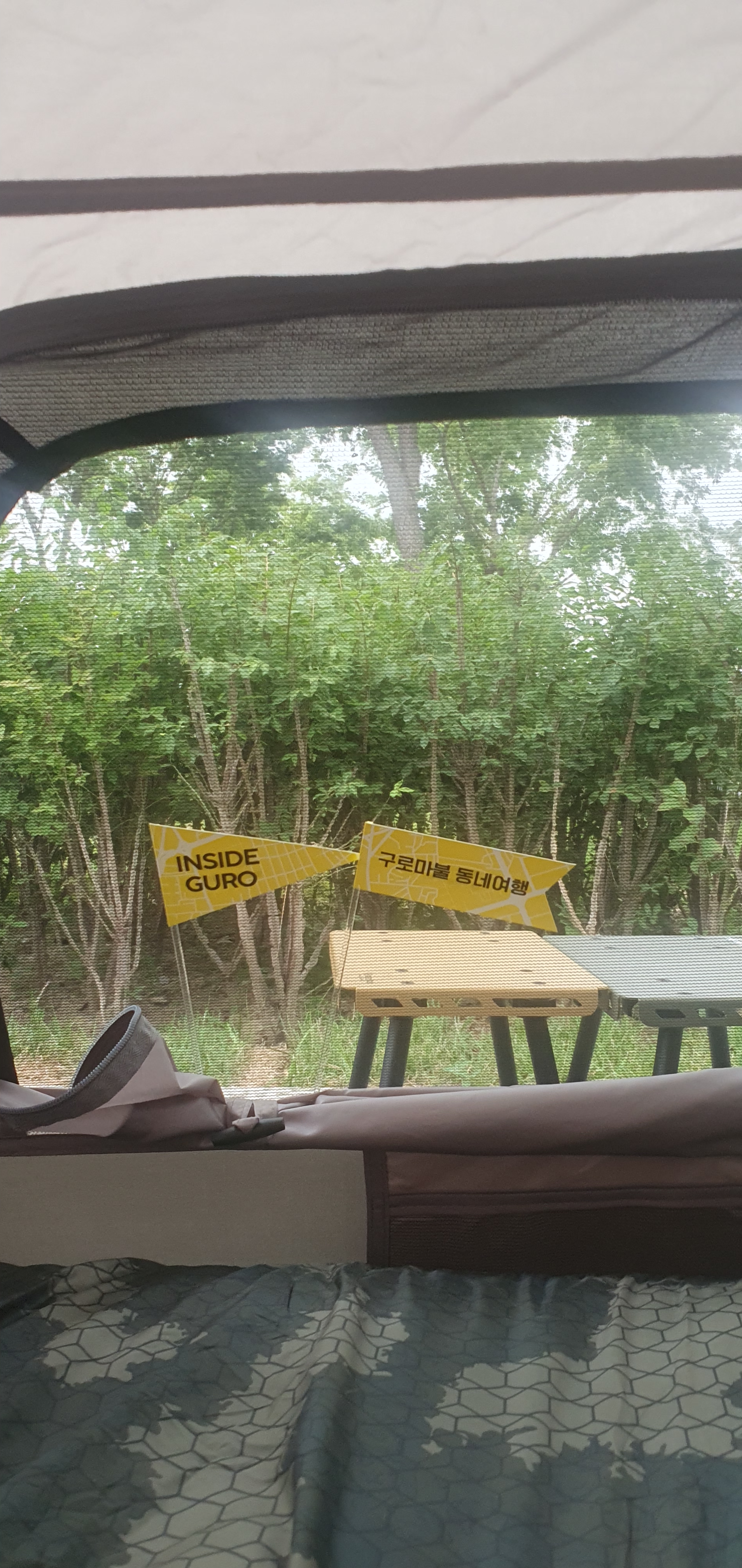 아침 일찍부터 바쁘게 일정을 돌아다닐 수 있게 했던 힘은 사실 마지막 장소에 대한 기대감에서 오지 않았을까? 안양천에는 또 하나의 아직 많이 알려지지 않은 공간이 있다. 구로 피크닉 가든이 바로 3번째 코스의 목적지이다. 주섬주섬 가져온 짐을 풀어 그늘을 만들고 우리만의 힐링 공간을 준비하는 동안, 지나가던 여러 사람들로부터 피크닉존을 어떻게 하면 이용할 수 있는지 질문 받곤 했다. 친절히 서울시 예약 누리집에 가서 예약하고 사용하면 된다고 설명을 드리면서도, 많은 사람들이 알게 되면 예약이 더 힘들어질텐데 하는 걱정이 들었다. 하지만 이렇게 좋은 곳은 결국에 모두가 알게 되어있다. 그냥 오늘은 앞으로의 일은 고민하지 말고 지금의 여유를 만끽하기로 했다.