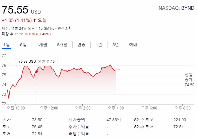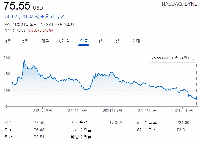비욘드미트의 2021년 11월 25일 주가는 75.55로 마감했다.